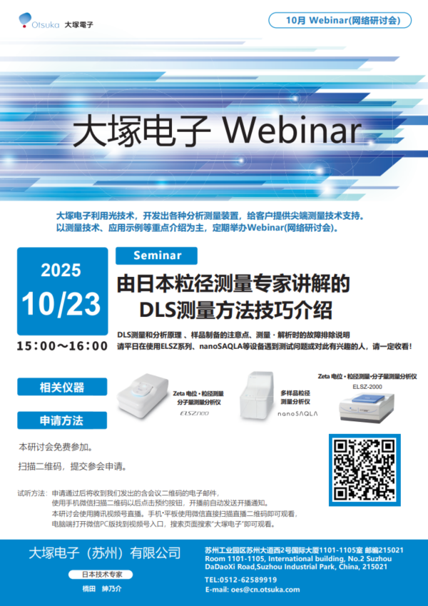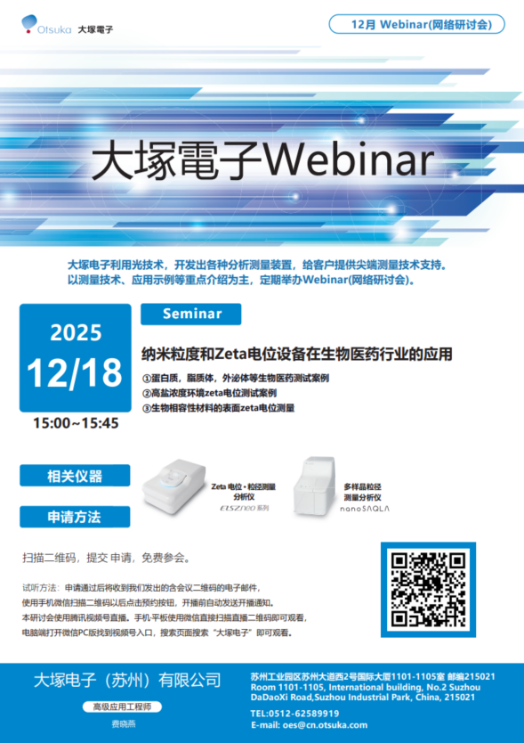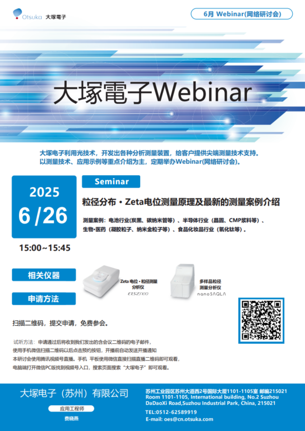 大塚電子的 Zeta 電位測量系統(tǒng)“ELSZ 系列”不僅可以測量溶液中膠體粒子的 Zeta 電位,也可以測量平板狀、薄膜狀樣品的 Zeta 電位。通過這樣的測量可以評價平板狀樣品的表面改質(zhì)狀態(tài)以及液體中粒子的吸著特性。本次研討會將介紹其應(yīng)用。